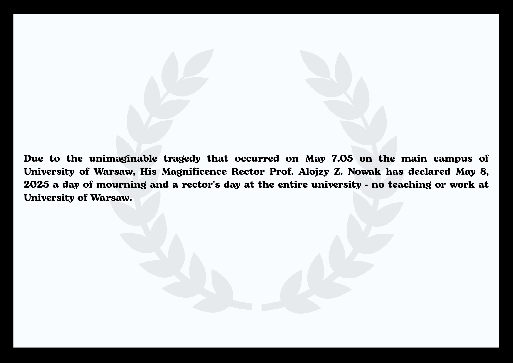 Wszyscy członkowie społeczności mogą liczyć na wsparcie uczelni. Jednocześnie prosimy o uszanowanie pamięci ofiary tragicznego zdarzenia z 7 maja 2025 roku i nierozpowszechnianie materiałów audiowizualnych przedstawiających miejsce zbrodni.